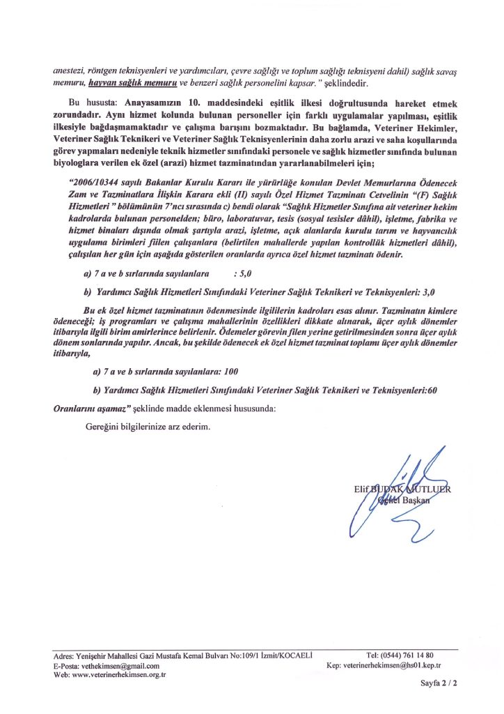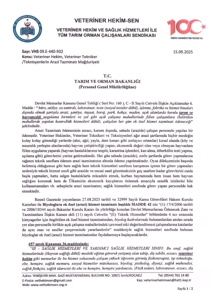 Veteriner Hekimler, Veteriner Sağlık Tekniker ve Teknisyenleri için Arazi Tazminatı Talebimizi Tarım ve Orman Bakanlığı ile Gerekli Mercilere İlettik.