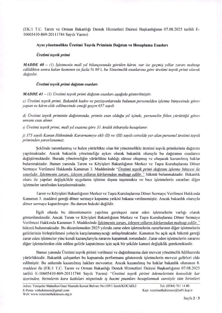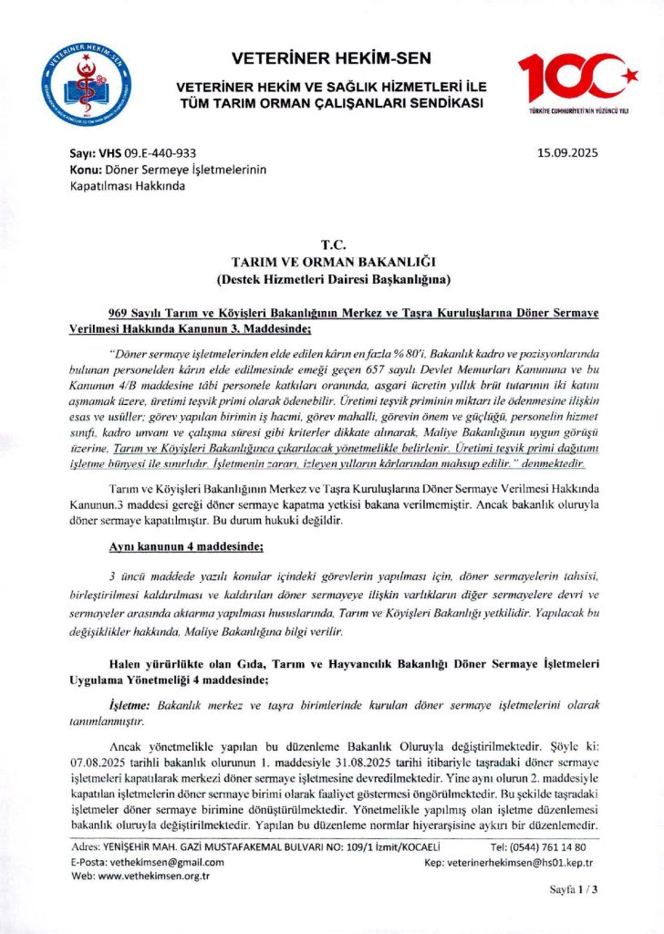 Hızlı hareket edemeyen bu kurumların üretim hızı düşecek, Devlet zarara uğrayacak. Üstelik aşı ve antiserum üreten, halk ve hayvan sağlığının teminatı olan işletmeler de malzemeye zamanında ulaşamazsa; sadece kurumlar değil, toplum sağlığı da risk altına girecek! Bu karar ne kamu yararına, ne de çalışanların emeğine hizmet ediyor. Üreteni cezalandıran bu düzenleme, hem memurun alın terini hem de halkın sağlığını tehlikeye atıyor. Tarım ve Orman Bakanlığına bağlı kurum ve kuruluşların gelirleri Bakanlıkta toplanacak ise: Devletimizin gelir kapısı, üretim, kontrol ve laboratuvar hizmeti sunan, kendi gelirini üretebilen ayrıca halk, hayvan ve çevre sağlığı için kritik öneme sahip kurum ve kuruluşlar;