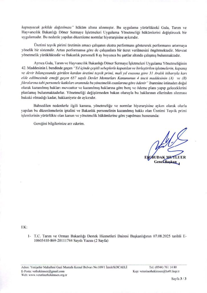 Mali özerklikleri ve işleyiş serbestlikleri korunmalıdır. Bu yaklaşım, personelin emeğinin ve haklarının korunması hem de halk sağlığı ve hayvan sağlığının güvence altına alınması için zorunludur. Veteriner hekimin emeği toplumun güvencesidir, bunun bedeli ise herkesin geleceğidir. Aksi takdirde nitelikli personel, emeğinin karşılığını göremediği için yurt dışında çalışmayı ya da özel sektöre geçmeyi tercih edecek; bu da Tarım ve Orman Bakanlığı yani ülkemiz için büyük bir kayıp olacaktır.