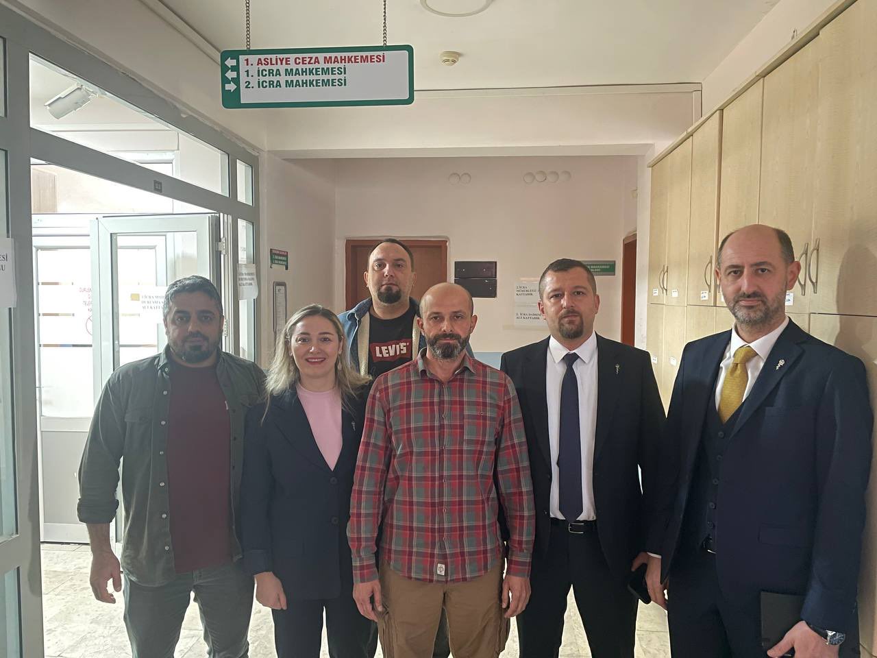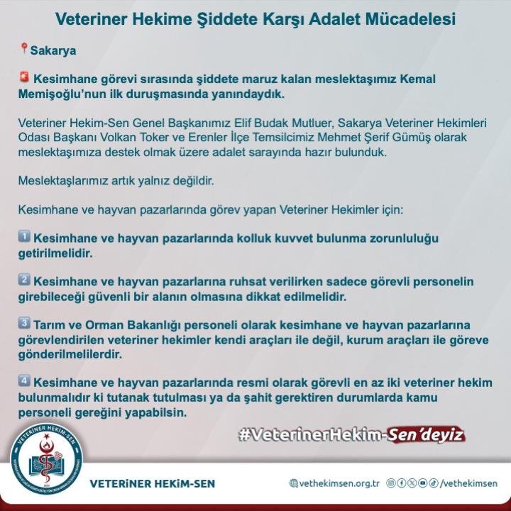 Kesimhane görevi sırasında şiddete maruz kalan meslektaşımız Kemal Memişoğlu’nun ilk duruşmasında yanındaydık. Veteriner Hekim-Sen Genel Başkanımız Elif Budak Mutluer, Sakarya Veteriner Hekimleri Odası Başkanı Volkan Toker ve Erenler İlçe Temsilcimiz Mehmet Şerif Gümüş olarak meslektaşımıza destek olmak üzere adalet sarayında hazır bulunduk.
