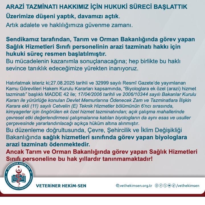 Çevre, Şehircilik ve İklim Değişikliği Bakanlığında Sağlık Hizmetleri Sınıfında bulunan biyologlara bu tazminat ödenebiliyorken, Tarım ve Orman Bakanlığında görev yapan personele neden ödenmemektedir? İşte toplu sözleşmenin ve hukukun amacı tam da budur: Eşitsizlikleri gidermek, hakkı hak sahibine teslim etmek. Geçmiş KİK kararları ve toplu sözleşme hükümleri incelendiğinde; veteriner hekimler başta olmak üzere, Tarım ve Orman Bakanlığında sahada görev yapan tüm Sağlık Hizmetleri Sınıfı çalışanlarının yıllardır neden birçok haktan mahrum bırakıldığı açıkça görülecektir. Talebimiz nettir: Görev tanımı, fiili çalışma koşulları ve emsal KİK kararları dikkate alınarak; Tarım ve Orman Bakanlığında görev yapan Sağlık Hizmetleri Sınıfı personeline arazi tazminatının ödenmesi ve bu uygulamanın kalıcı hale getirilmesidir. Birlikte olduğumuz, birlikte mücadele ettiğimiz için teşekkür ediyor; 2026 yılının hepimiz için kazanımlarla dolu bir yıl olmasını diliyoruz. #VeterinerHekimSendeyiz#ÇALIŞANSENDİKA