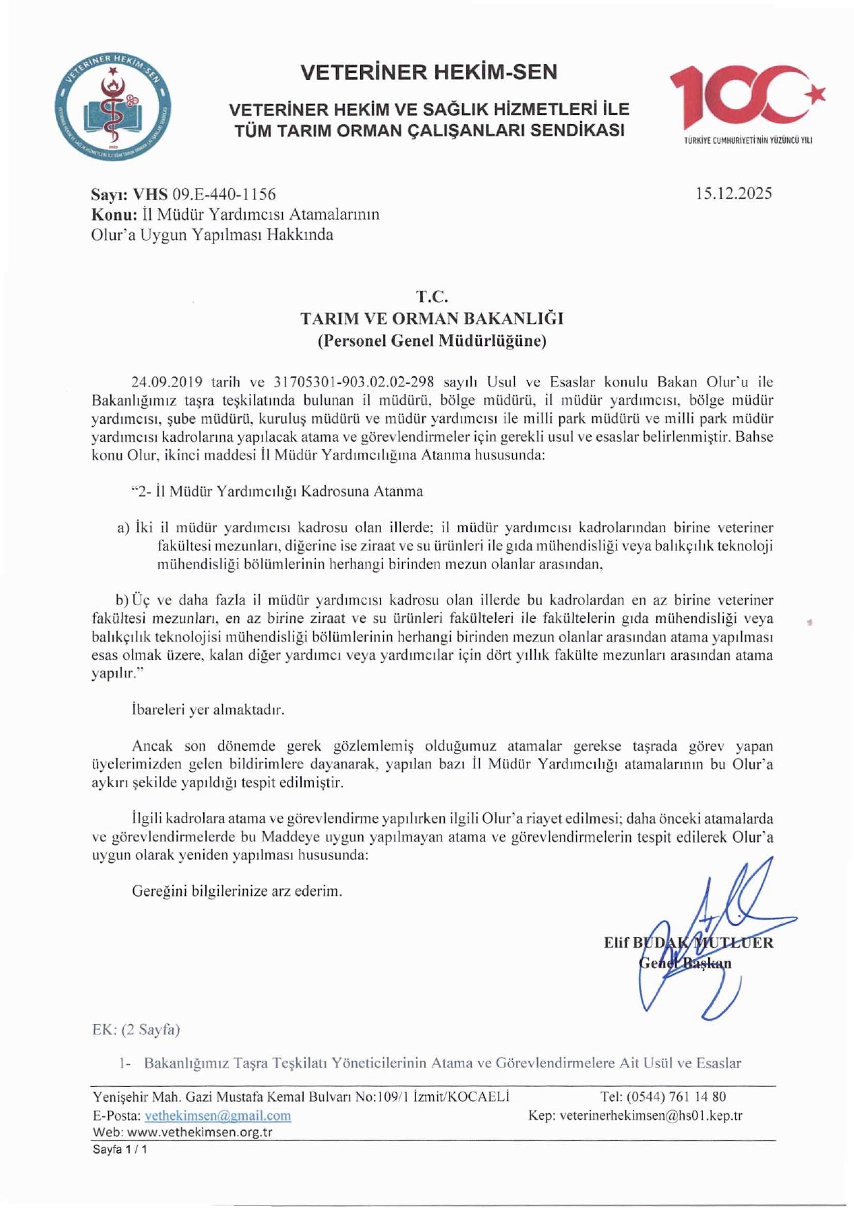Üç ve daha fazla yardımcısı olan illerde; en az bir koltuğun veteriner hekim olması yasal bir zorunluluktur.  Saha gözlemlerimiz ve üyelerimizden gelen bildirimler, bazı illerde bu “Olur” metnine aykırı atamalar yapıldığını göstermektedir. Bakanlık Personel Genel Müdürlüğüne resmi başvurumuzu yaparak; usulsüz atamaların iptal edilmesini ve liyakatin ivedilikle tesis edilmesini talep ettik.  Mesleki haklarımızın gasp edilmesine ve mevzuatın kağıt üzerinde kalmasına sessiz kalmıyoruz.