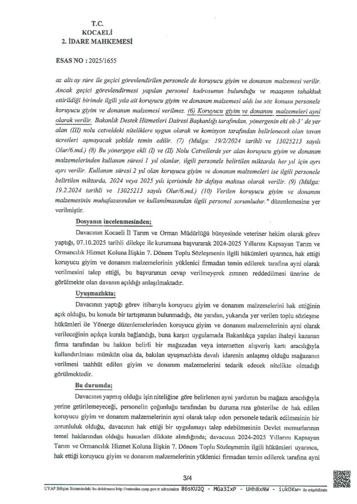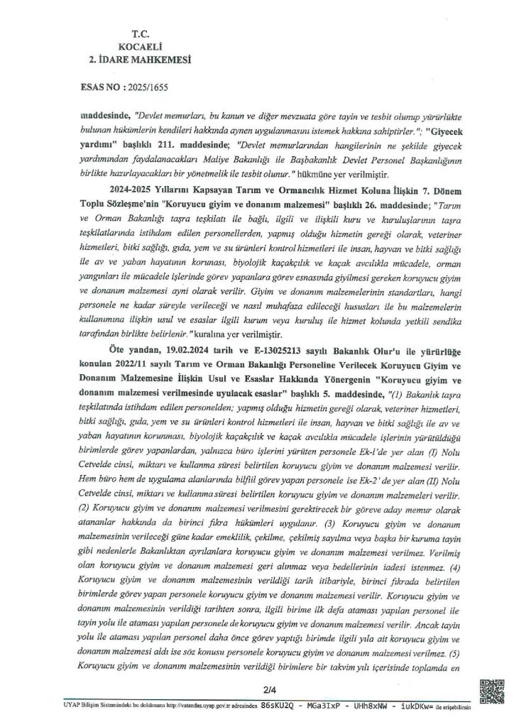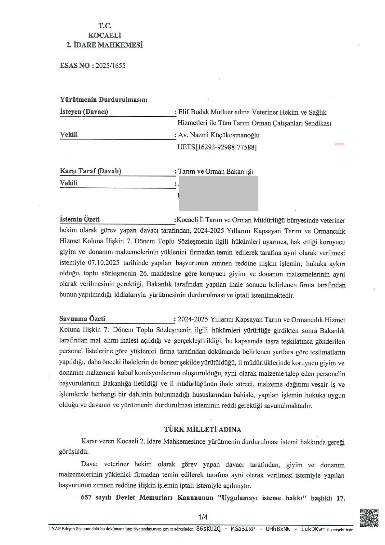 Sendikamızca TACREO kartı almayan üyelerimiz adına açılan davada: Kocaeli 2. İdare Mahkemesi, Tarım ve Orman Bakanlığının koruyucu giyim yardımıyla ilgili olarak “Hukuka aykırı bu uygulama için Yürütmeyi Durdurma kararı verildi. Üyelerimizin emeğini ve yasal haklarını hiçbir “ihale” oyununa kurban ettirmeyiz.