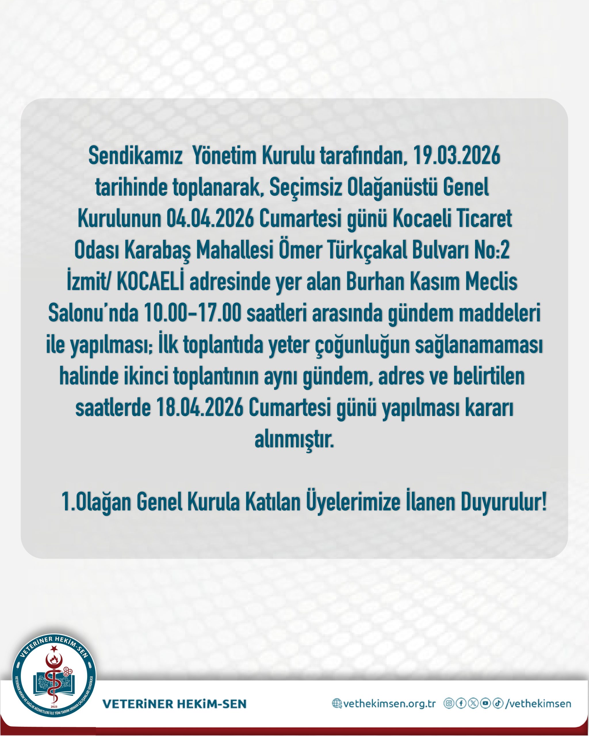 Sendikamız Yönetim Kurulu tarafından, 19.03.2026 tarihinde toplanarak, Seçimsiz Olağanüstü Genel Kurulunun 04.04.2026 Cumartesi günü Kocaeli Ticaret Odası Karabaş Mahallesi Ömer Türkçakal Bulvarı No:2 İzmit/ KOCAELİ adresinde yer alan Burhan Kasım Meclis Salonu’nda 10.00-17.00 saatleri arasında gündem maddeleri ile yapılması;