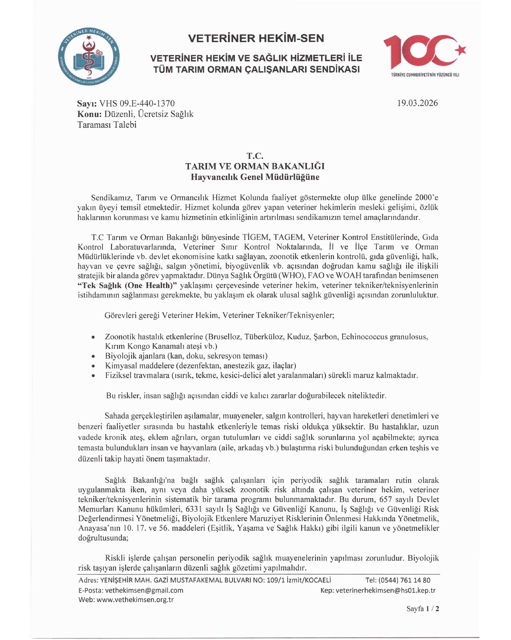 T.C. Tarım ve Orman Bakanlığı çalışanlarının periyodik, ücretsiz sağlık taraması yapılması gerektiği talebimizi ilettik.